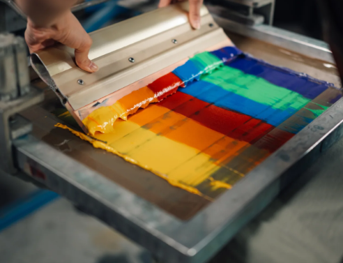 Screen printing is the process of pushing ink through a screen onto the fabric
